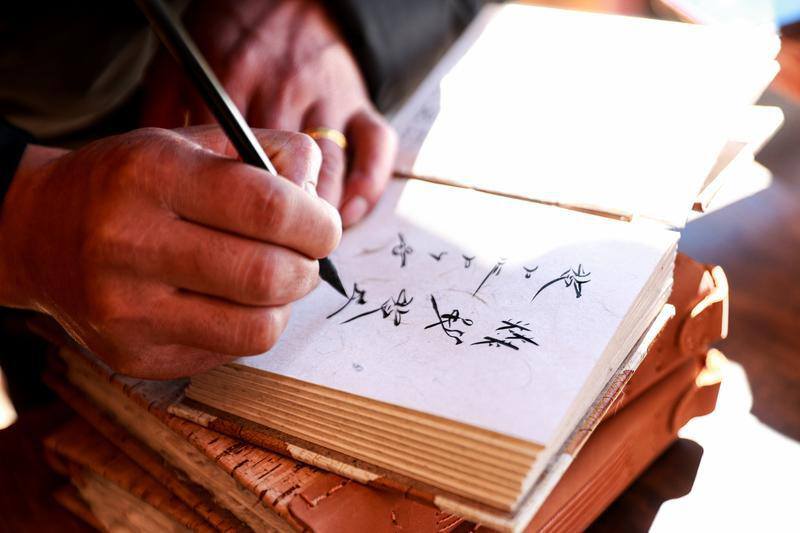 “非遗”文创店内,店主正在用东巴文为游客写下祝福。