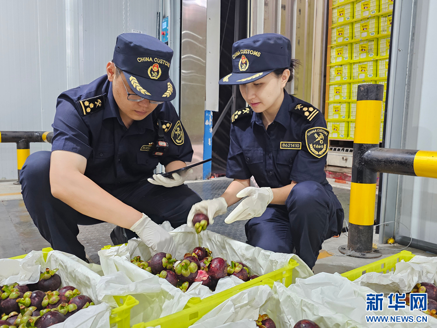 2025年7月31日,勐腊海关关员在磨憨铁路口岸对进口山竹进行监管。新华网发(周炜 摄)