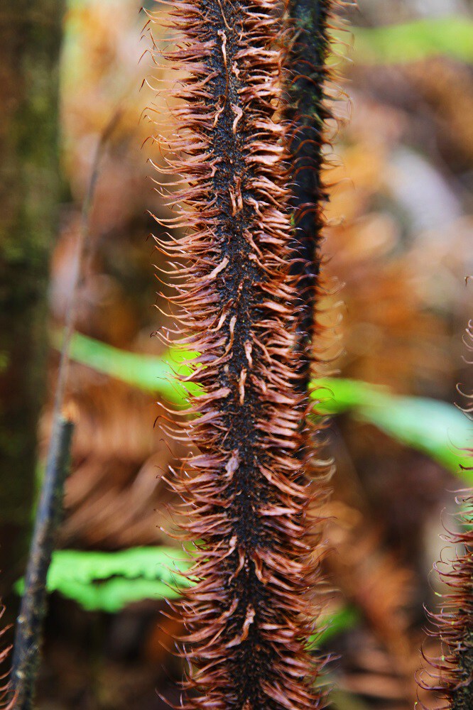 毛叶黑桫椤在我国主要分布于云南、西藏等地,在云南龙陵主要生长在原始密林或针阔混交林中。它的树形优美高大,树高可超过10米,尤其是簇生于茎干顶端的叶子宛如一把巨伞。其最明显的特征是,紫黑色的叶柄上具有披针形的鳞片。