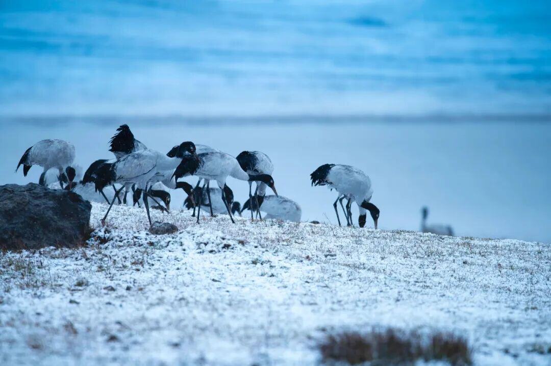 冬季走进大山包,万亩草场绵延辽阔,雪色静谧,黑颈鹤翩跹于湖天之间,如诗如舞,惊艳了整片寂静天地。