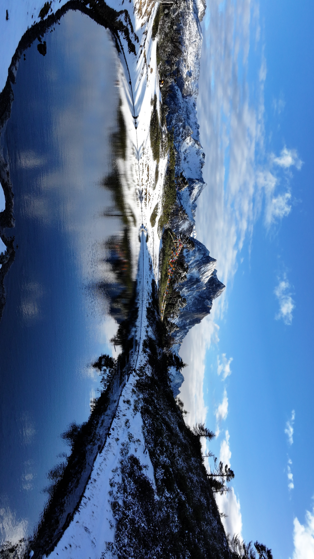 初冬时节,孔雀山被冬雪渲染成了银装素裹的仙境。雪山在流云雾霭间时隐时现,雪后初霁,天空澄澈如洗。“天心十二湖”越发澄澈,倒映着纯净无瑕的世界。