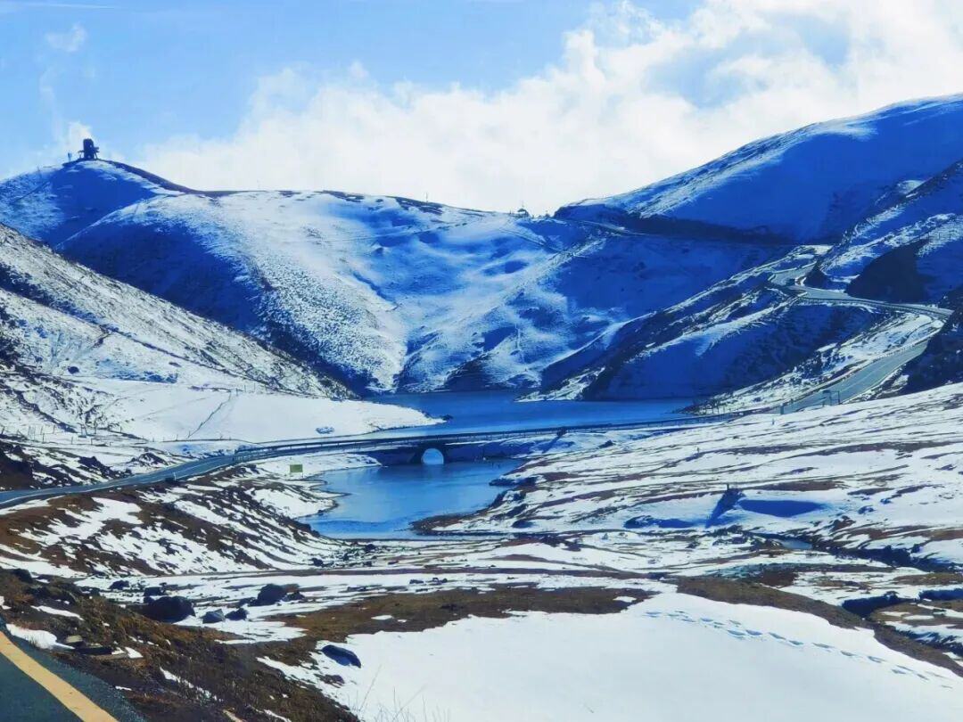 冬日来临,高山草甸褪去秋的黄绿,换上银白新装,宛如一片冰雪秘境,远山如黛,在雪的映衬下更显雄浑连绵。