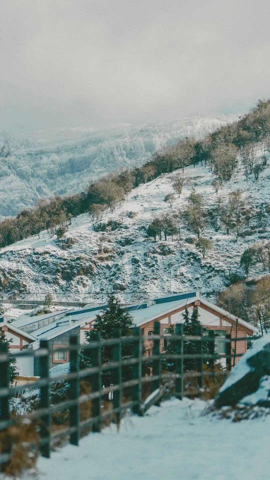 山峦草甸覆上绵厚的雪被,阳光偶尔穿透云层,洒落一地碎金,在皑皑雪原上跃动闪烁。村落静卧其间,雪盖矮檐,更添几分安详与宁和。