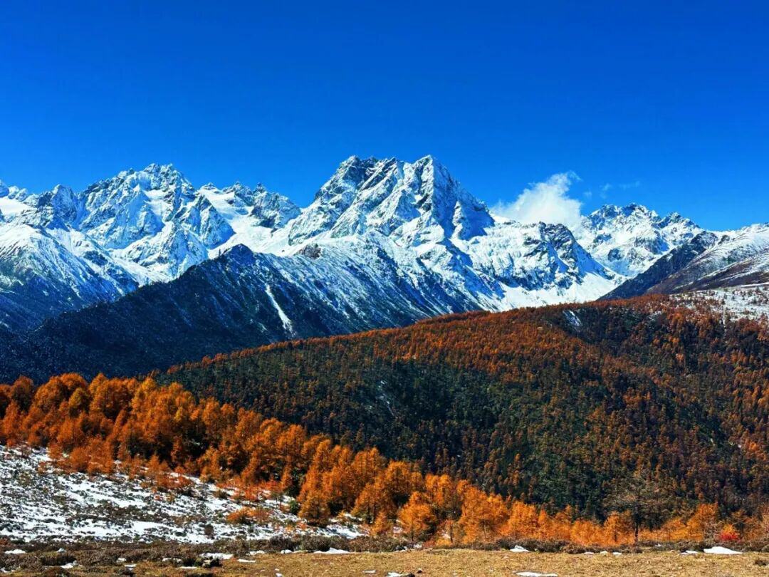 金黄的云杉坪与雪山相映。丽江市委宣传部 供图
