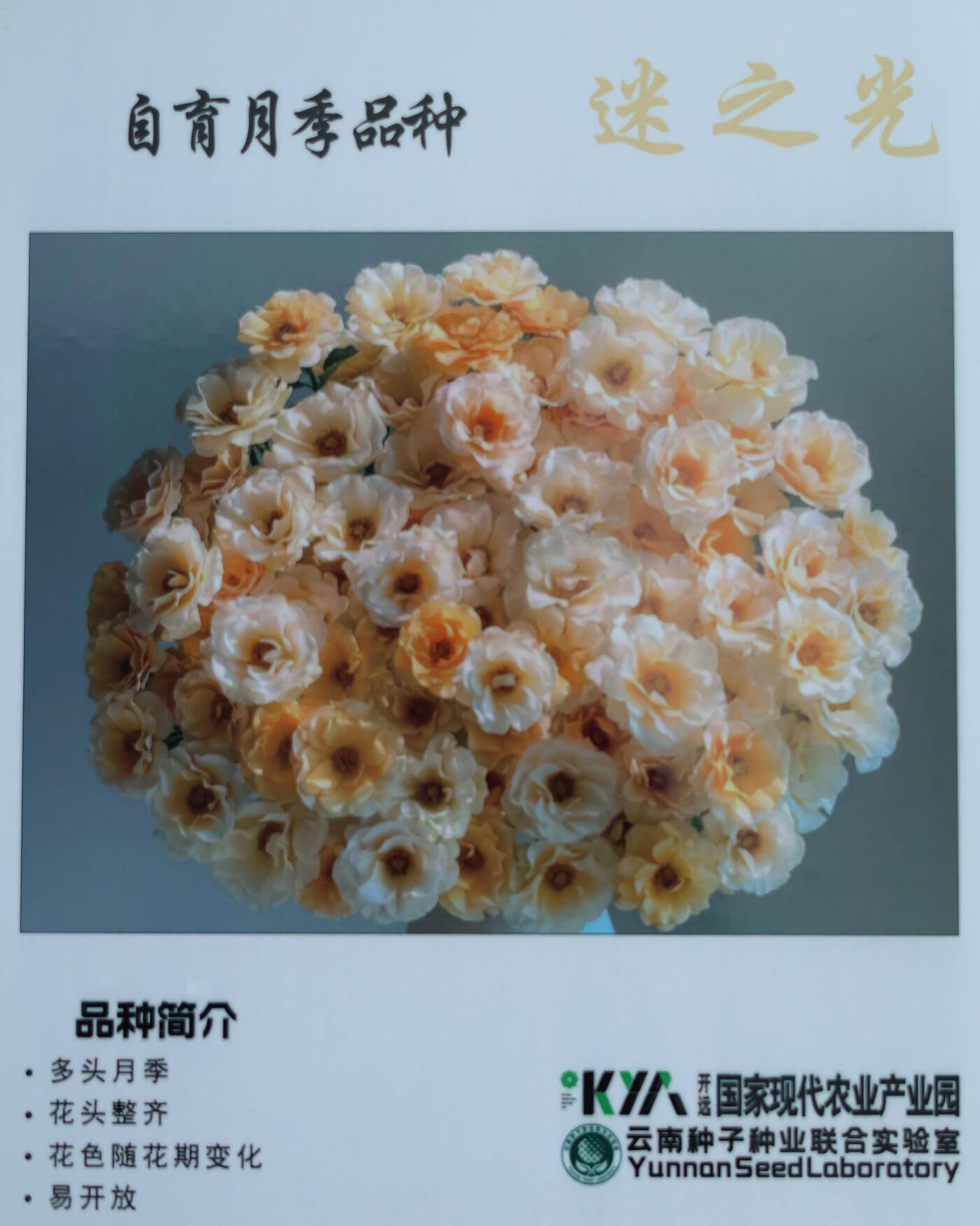 “迷之光”花瓣薄,疏阔,极具东方气韵,以开远古称“阿迷”为名,寓意泸江河上迷离变幻的光影,拥有纯粹的“中国芯”。其商品名为“花梨木”,具有多头香味、遇水即开特点,花瓣颜色随着瓶插时间延伸,金黄色由深至浅不断变化,从花蕾到凋零,如花梨木的木色,随岁月沉淀而愈发温润醇厚。