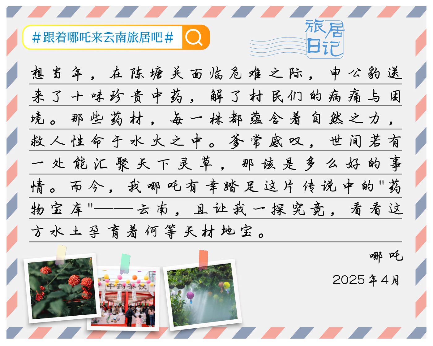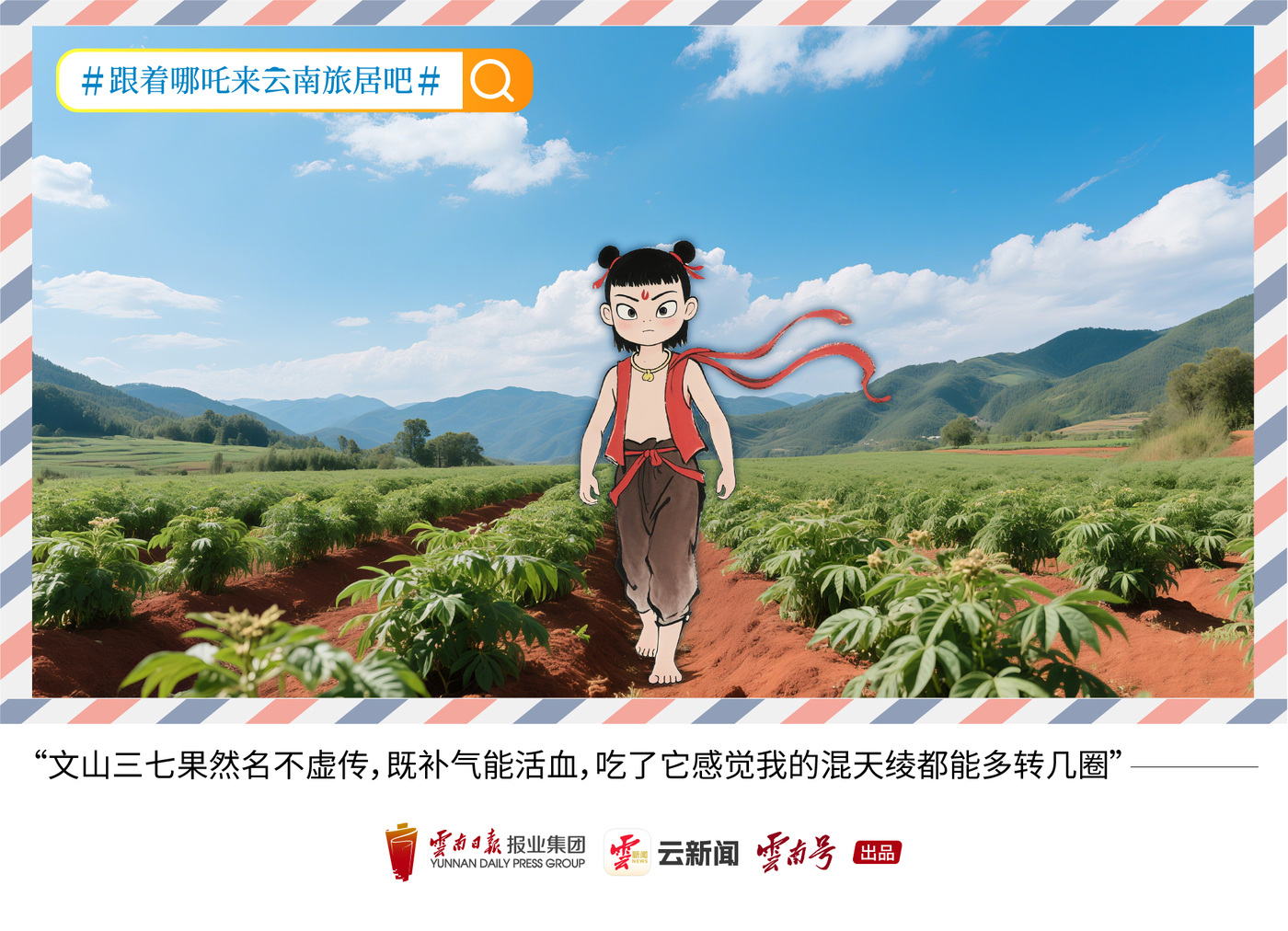 脚踩风火轮、手持乾坤圈、腰缠混天绫……“五一”假期,“百亿票房男主角”哪吒风风火火地降落在七彩云南,这次他可不是来宣传电影的!《哪吒之魔童闹海》在全球上映后,给了海内外观众“亿”点点“中国震撼”。这不,马上就要到炎热的夏天了,哪吒收到了好客的云南人民的邀请,来彩云之南避避暑、享受旅居生活。