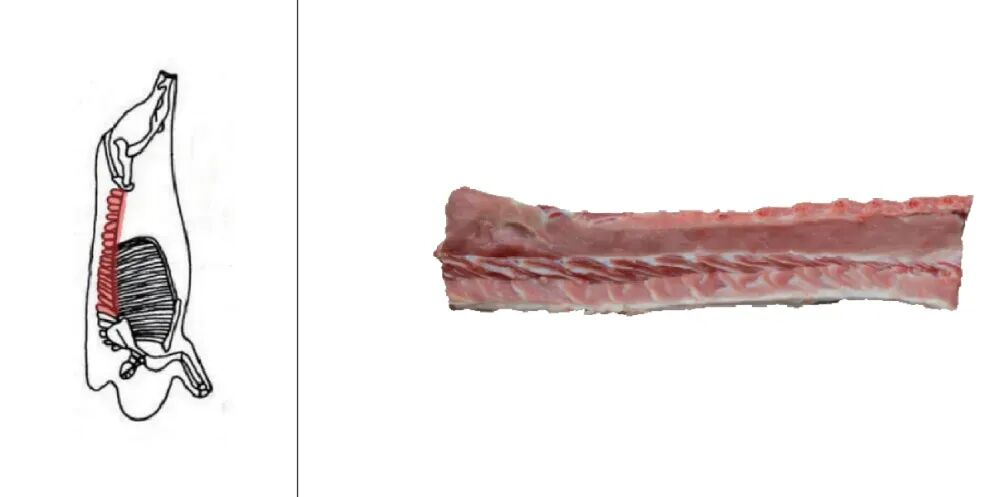 猪脊骨也叫猪龙骨、猪腔骨,自猪的第五、第六胸椎间至腰椎第四处锯断,并取出背最长肌,表面肉色呈鲜红色的骨头。骨头占比较高,肉相对少,肉质口感偏紧实,也就是常说的“有点柴”。