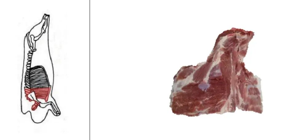 取自猪第五、第六椎间至颈椎部位脊骨,去除颈背肌肉,带胸骨和五根肋骨的部位肉。猪小排则是猪前排有肋骨部位,带肋骨5根~6根,去脊椎,硬胸骨,呈“A”字形的部位肉。猪前排往往会带一点软骨、筋膜和更复杂的骨边结构,肉不算厚,但口感很丰富,既有肉香,也有软骨的脆嫩。