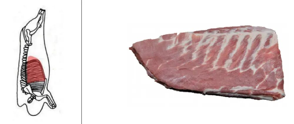 取自猪的肋骨部分,就是从猪背脊下面、五花肉上面,连接大排和肋排的一部分分割出来的一块(概念上叫带骨中方肉)。大多形状规则,有骨有肉,吃起来很香、口感丰富,啃起来更是清爽。