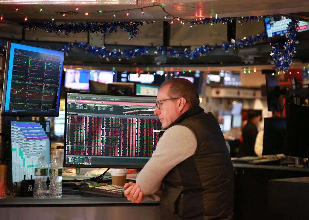 2025年12月12日,一名交易员在美国纽约证券交易所交易大厅内工作。纽约股市三大股指当日下跌。