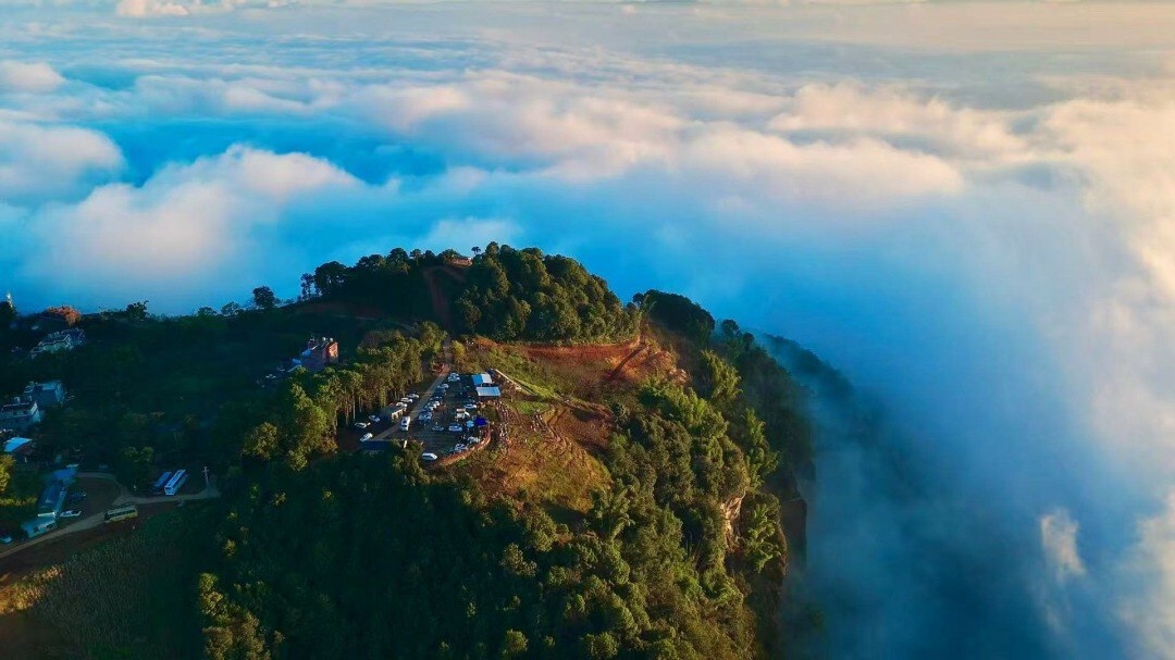 在酒店观景台,看云海翻涌、旭日东升,金光洒满群山,宛若仙境,寓意新年光明辉煌。