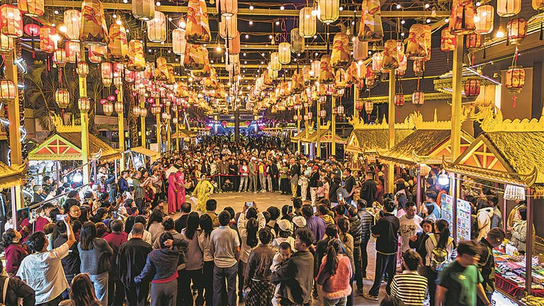 在芒市广场,一场“万人共舞过大年”目瑙纵歌体验活动将节庆气氛推向高潮,身着节日盛装的景颇族群众与来自天南海北的游客手牵手、肩并肩,跟随着领舞“瑙双”的步伐,载歌载舞。勐焕银塔景区内,《孔雀起舞的地方》专场演出每天定时上演,傣家儿女婀娜的舞姿与银塔的圣洁交相辉映,为游客带来沉浸式的视觉盛宴。傣族古镇则推出了璀璨烟花秀、非遗象脚鼓舞展演,每晚的民族篝火打跳让游客流连忘返。珠宝小镇里,民族文化产品、特色美食、农特产品展销一条街人气爆棚,游客在欣赏歌舞之余,还能把德宏的味道带回家;在瑞丽,边境风情成了最吸金的招牌,瑞丽古城每天举行盛大的迎宾仪式,《王朝盛景·边城夜秀》实景演出震撼开场,绚丽的灯光、宏大的场景再现了果占壁王朝的辉煌。姐告国门广场上,“非遗过大年”主题活动人气高涨,傣族剪纸、孔雀舞等非遗代表性传承人现场展示技艺,游客还可以亲自体验。弄莫湖畔,夜夜目瑙纵歌成为市民和游客的固定节目,大家围着广场纵情歌舞,直至深夜;陇川县将民族节庆与体育赛事巧妙融合,“醉美千人景颇绿叶宴”精彩开席,傈僳族阔时节和德昂族龙阳节相继举行,各族群众身着盛装,跳起欢快的三弦舞和龙阳舞;盈江县充分发挥生态资源优势,在泼水广场、江畔沙滩等地打造了一系列休闲体验活动,“舞蹈大家跳”现场,群众和游客围成圆圈,跟着音乐的节奏自由起舞,无论男女老少都尽情摇摆;梁河县推出的“四节”联欢系列主题活动,从除夕一直持续到初七,实现“日日有活动”,葫芦丝文化旅游节是重头戏,葫芦丝大赛、颁奖晚会、名家演奏会轮番上演,悠扬的丝竹之音回荡在山谷间,为新春增添了一抹雅致。