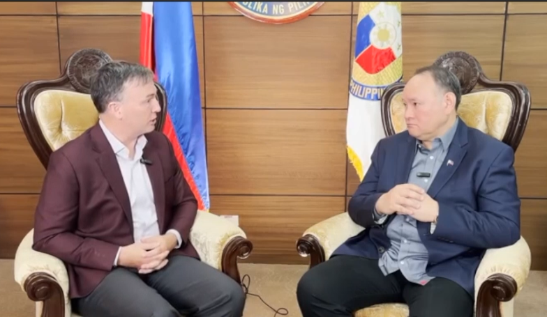 雷蒙德·鲍威尔(左)与菲律宾国防部长吉尔伯特·特奥多罗进行访谈。(来源:“海光计划”网站视频截图)