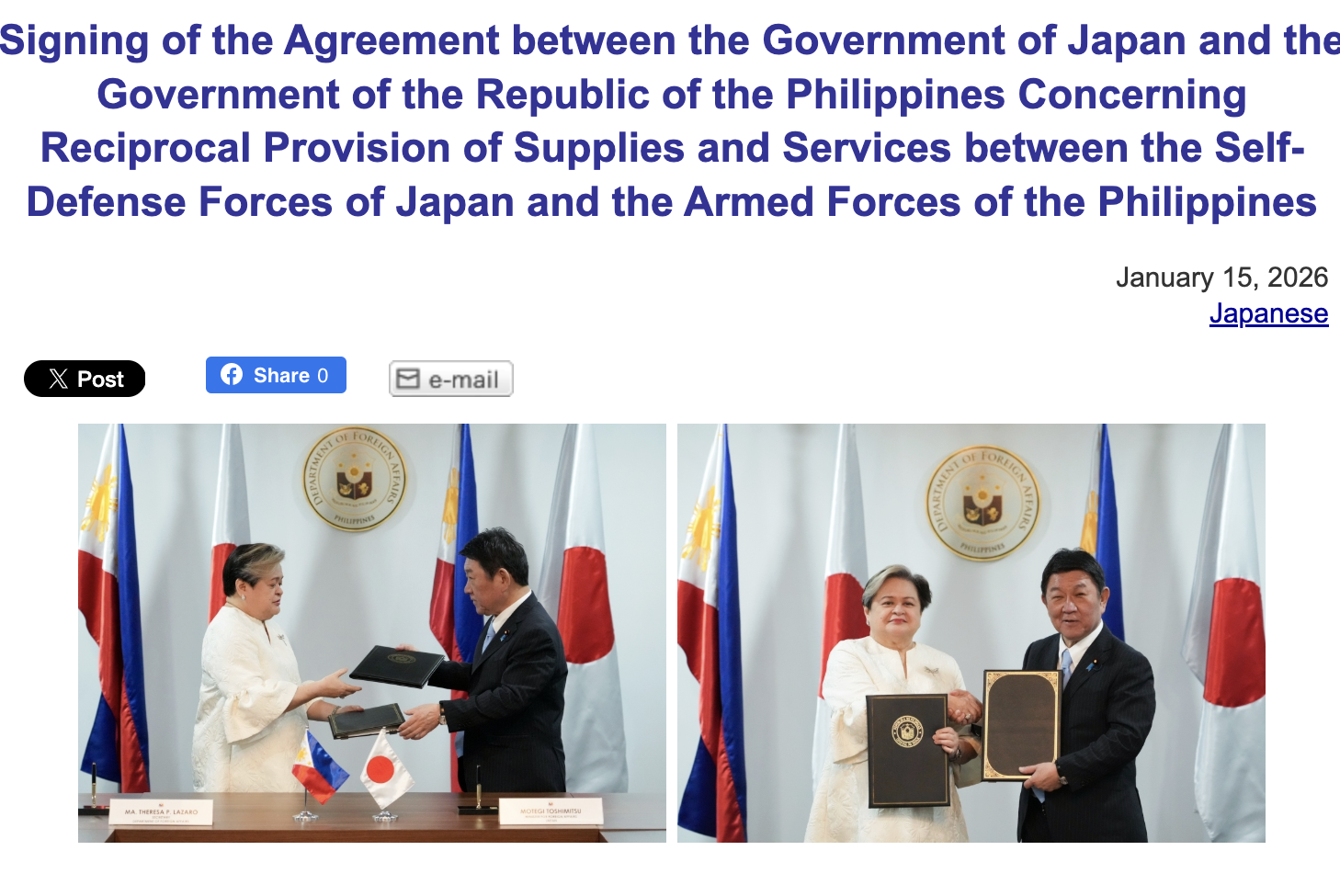 2026年1月15日,日菲签署《物资劳务相互提供协定》(来源:日本外务省官网)