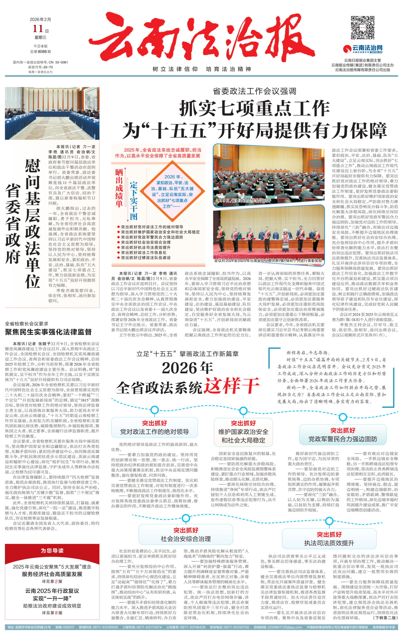 时值“十五五”谋篇开局的关键节点,2月9日,省委政法工作会议在昆明召开。会议充分肯定2025年工作成效,深入分析云南政法工作的历史方位和形势任务,全面部署2026年政法工作重点任务。