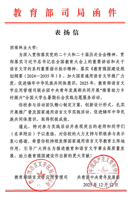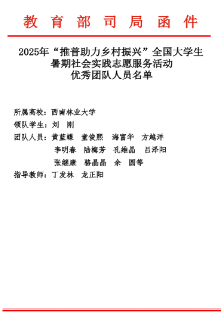 近日,西南林业大学文法学院牵头组建的大学生暑期社会实践志愿服务队,获评2025年“推普助力乡村振兴”全国大学生暑期社会实践志愿服务活动优秀团队。这是该校首次入选该项目国家级重点团队并获评全国优秀团队。