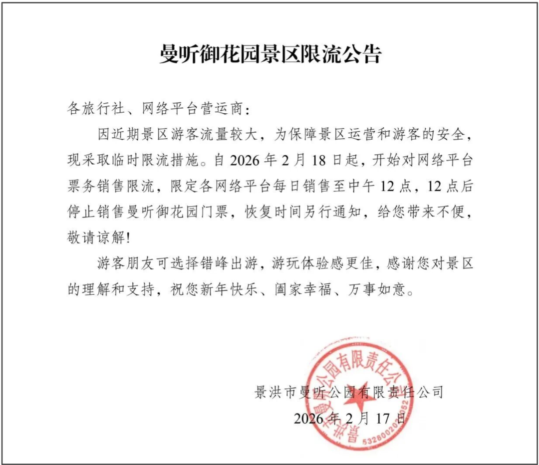 西双版纳曼听御花园景区发布限流公告