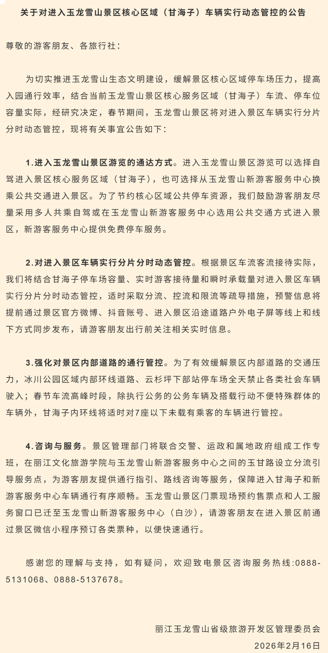 丽江玉龙雪山省级旅游开发区管理委员会发布公告称