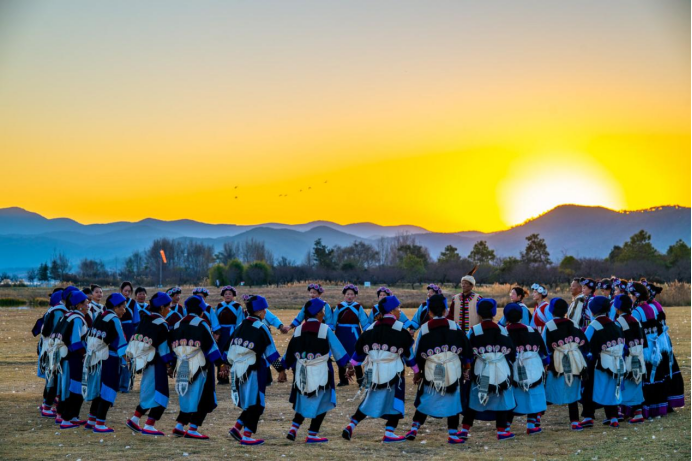 纳西族群众身着节日盛装表演传统舞蹈“打跳”。