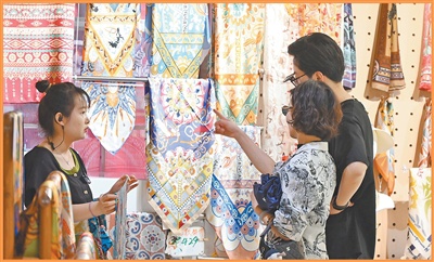 博物馆里看文物、感受历史,馆外,敦煌文化同样可感可知。三兔共耳图案丝巾、藻井纹样包袋,令游客爱不释手。天津游客张女士说:“原来‘敦煌’还能穿在身上,很时尚。”