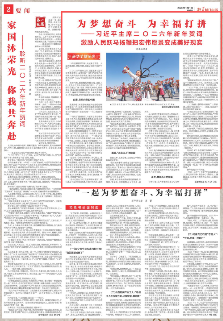 二〇二六年到来之际,国家主席习近平发表新年贺词,深情回顾“十四五”收官之年中国式现代化的奋进轨迹,激励全党全国各族人民在“十五五”开局之年续写中国奇迹新篇章。