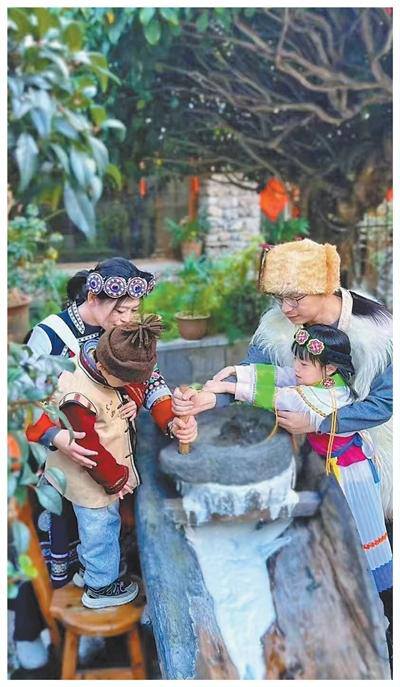 云南丽江,游客在体验磨豆花。 和玉月摄