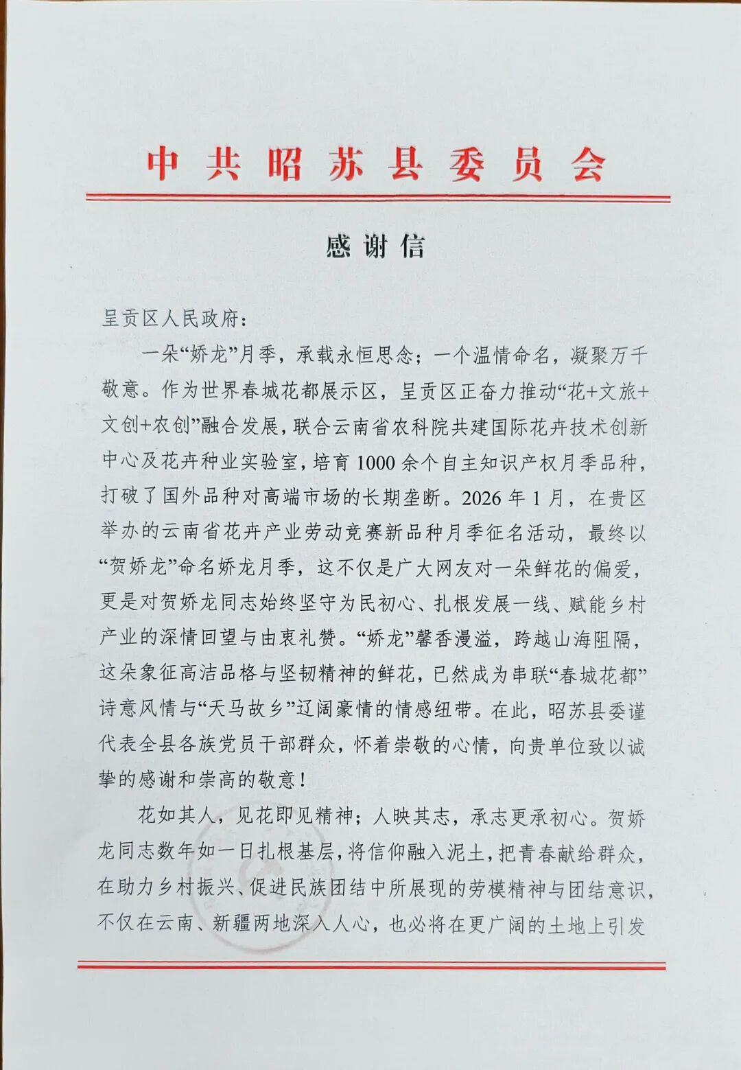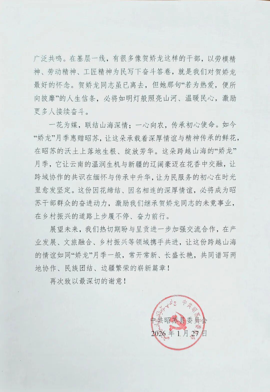 新春将至,呈贡区收到一封来自2400公里外新疆昭苏县的感谢信。昭苏县委、县政府代表全县各族干部群众,向呈贡区致以诚挚感谢和崇高敬意。一朵名为“娇龙”的月季,跨越云岭与天山,成为连接两地、铭记奉献、助力振兴的精神纽带。