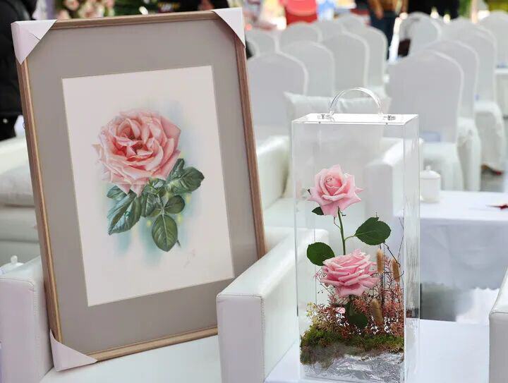 “娇龙”月季(右)和植物科学画家曾孝濂创作的“娇龙”月季画作。新华社