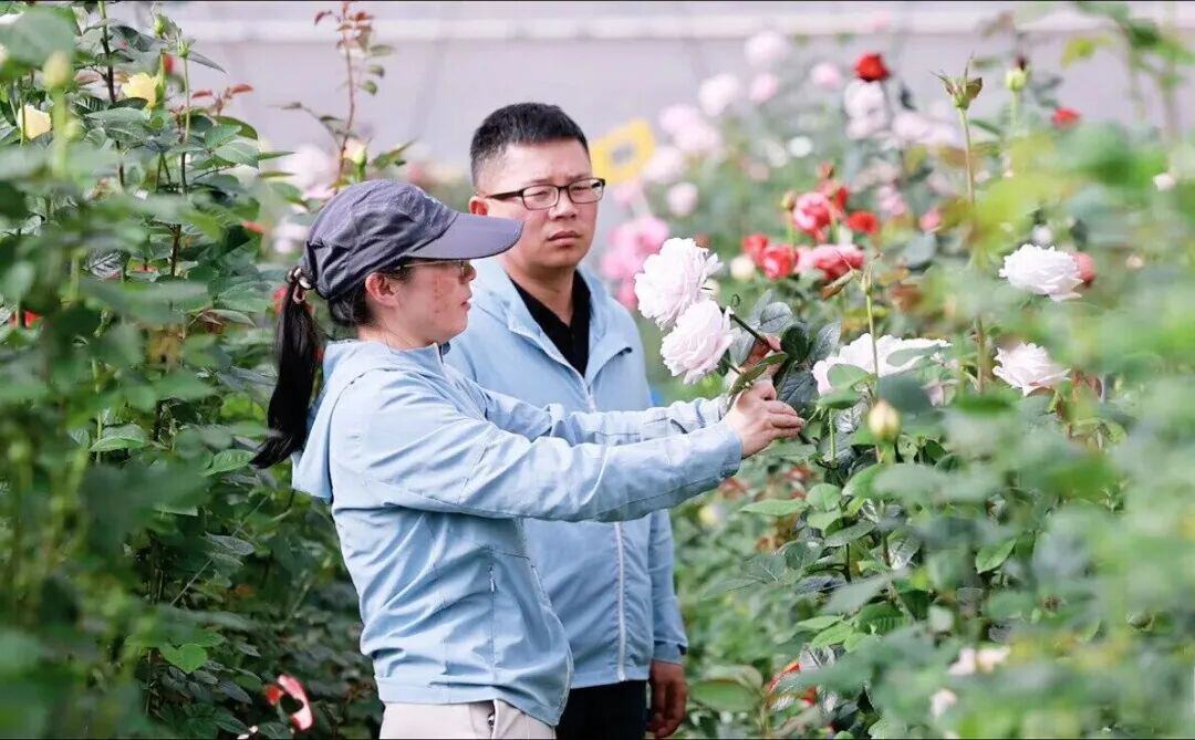 云南省农科院花卉研究所研究员观察月季新品种形态。云南日报-云新闻