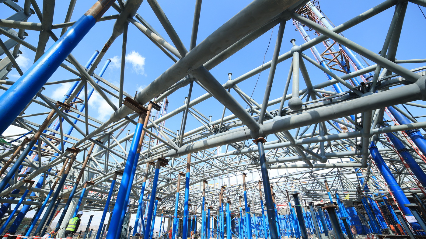 T2航站楼采用“大港湾双分叉”六指廊构型,整体造型如展开的羽翼,融入云南独特的生态人文元素。其“树形柱”支撑系统,形似绽放的花瓣,又如挺立的树木,与“华盖天窗”共同营造出“人随景移,人在景中”的“七彩春之林”意境,打造全国独具特色的花园式机场体验。中铁建工集团项目部负责人介绍,T2航站楼南段钢屋盖整体采用“空间网架+单层框架天窗结构”,最大安装标高为68.55米,总重约4319吨,相当于1080头成年亚洲象并肩站立;总面积约25961平方米,相当于3.6个标准足球场首尾相连。异形柱“精雕细琢”,采用6000吨液压机,将最大板厚85mm的钢板压制成弧形锥板,弧度误差控制在2毫米以内,确保花瓣柱外观无压痕,满足外露C级标准;52个最大重约60吨的铸钢节点,通过三维扫描与精准预拼装,实现与树形柱的毫米级对接,犹如“关节”般承力传力。屋盖“原位拼装+整体提升”,将屋盖划分为27个施工小区,在楼面进行原位拼装,集成马道、檩条等构件,减少高空作业;采用“分区分级多专业集成综合提升法”,通过液压同步提升系统,实现多区协同、精准就位,提升精度差控制在±1毫米。
