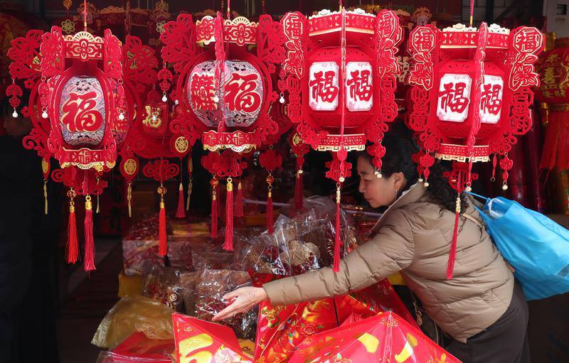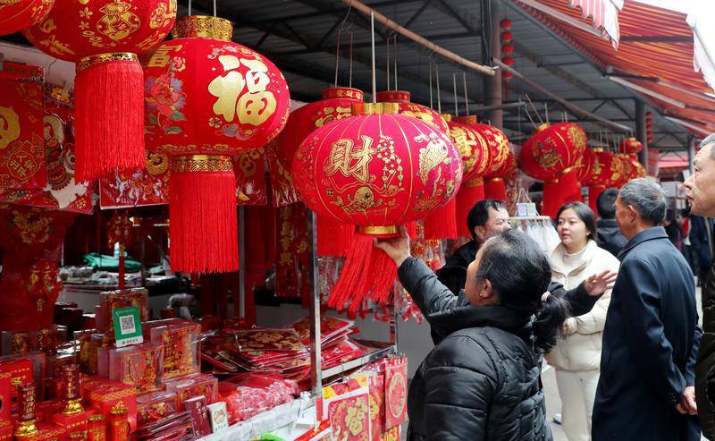 李棋综合农贸市场传统节庆饰品挂满摊位,红灯笼、春联等年货热销,节日的喜庆氛围浓郁。