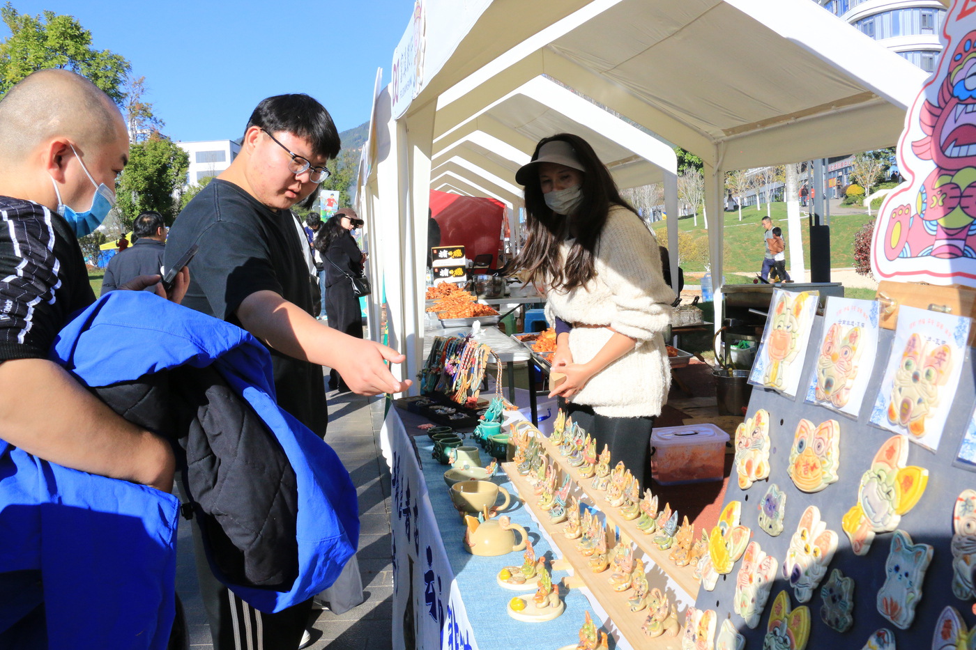 彩云集市上,来自全省各地的球迷在阳光草坪上载歌载舞,云南多个州(市)及玉溪 9 个县(市、区)的特色展区一字排开,怒江的山珍、普洱的茶韵、大理的非遗好物在此荟萃。大理的摊位前,扎染方巾、银器饰品、木雕小件等精致文创吸引着游客驻足,大理璞真扎染博物馆负责人段袁介绍:“我们特意带来便于携带的非遗小件,让大家把‘大理韵味’轻松带回家。玉溪之行我们也吃到了地道的米线,感受了玉溪的特色。”作为大理州集中展示的多项国家级、省级非遗代表,这些手工艺品与峨山彝族自治县的非遗展演、红塔区青花街的青花瓦猫制作体验相映成趣,让游客在逛吃购中触摸云南文化肌理。