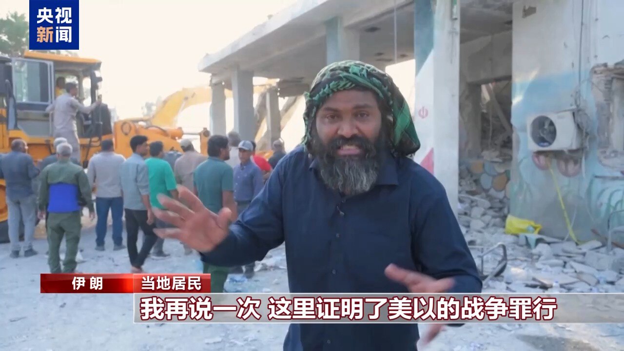 当地居民:我再说一次,这里证明了美以的战争罪行。看看这片废墟,这是一所学校,一所被炸毁的学校,被导弹轰炸的学校。你们看看,这是学校,不是军事基地,任何人都不能说这是军事基地。