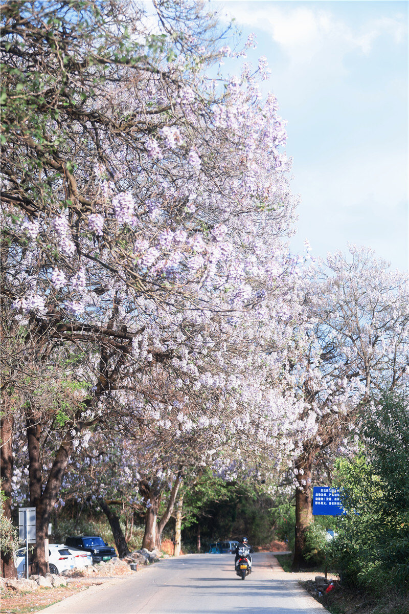 公路两侧淡紫色花朵连缀成廊