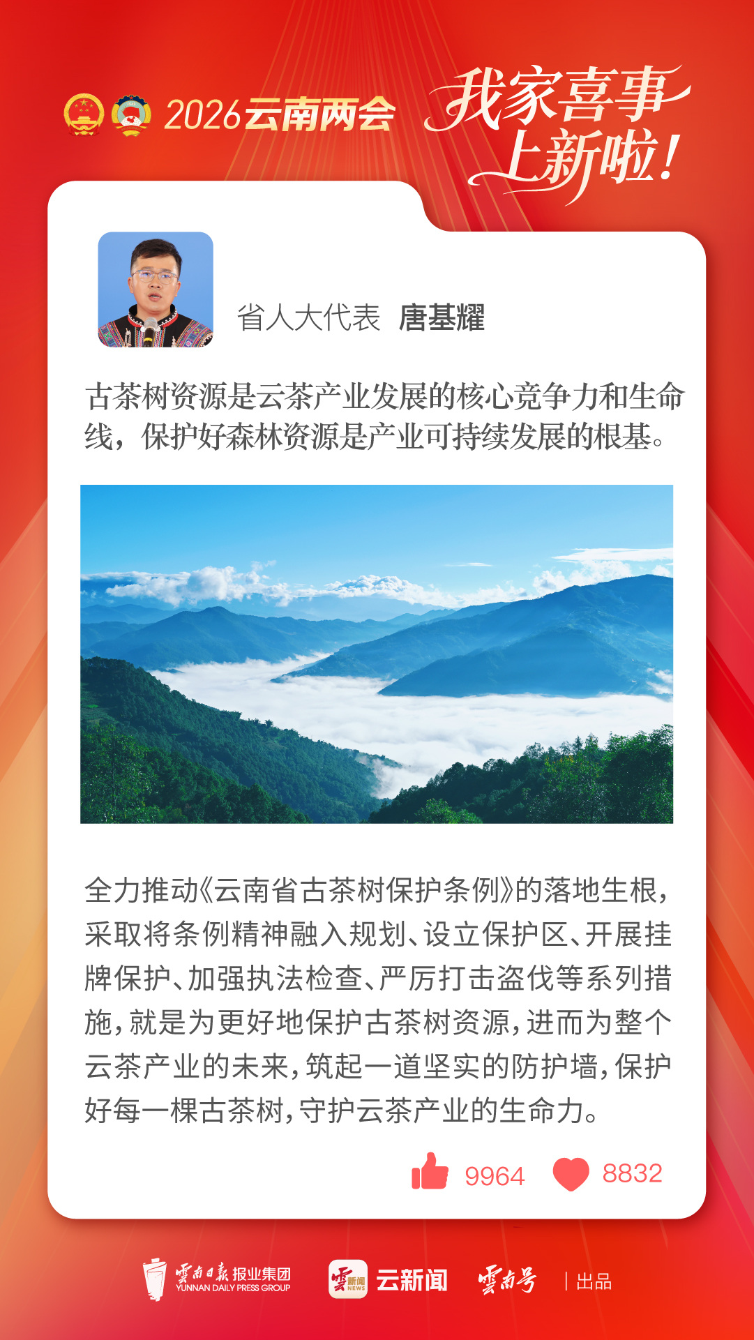 冬日的云南,茶山依旧青翠。在一年一度的“两会时间”里,云茶产业的发展,也成为各方关注点之一,省人大代表、勐海县林业和草原局资源监测中心主任、工程师唐基耀也分享了一桩喜讯:2025年8月吉尼斯世界记录认证勐海县连片古茶林为“世界最大连片古茶林”。