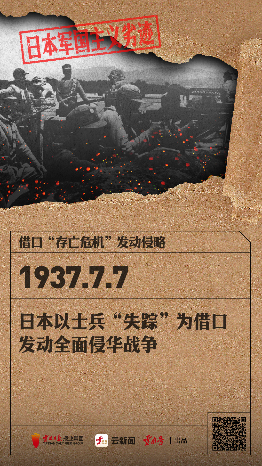云新闻推出“日本军国主义劣迹”系列报道,通过还原历史真相,揭示日本军国主义给世界带来的深重灾难。以史为鉴,敲响警钟。本期报道聚焦:1937年,日本以士兵“失踪”为借口发动全面侵华战争。