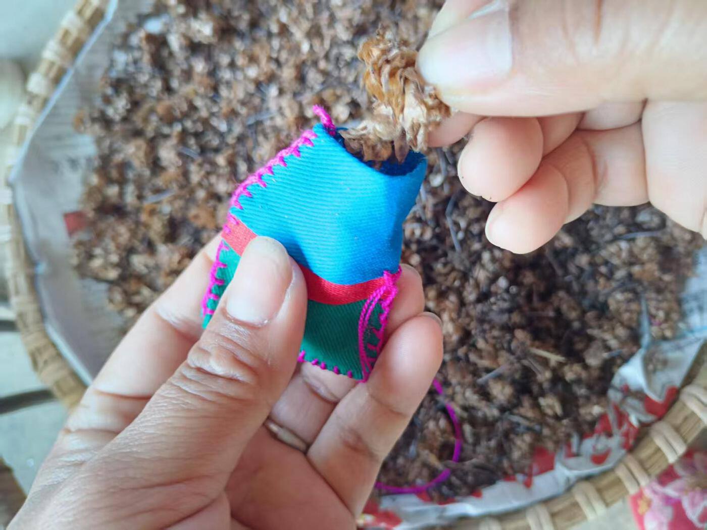 转机来自寨子旁的跳蚤草,这种天然驱蚊植物被刘智芳与哈尼刺绣结合,制成驱蚊香包,一跃成为合作社“爆款”。借着勐腊文旅融合与对外开放的东风,刺绣产品不仅销往省内外,更通过当地口岸走出国门。刘智芳还将跳蚤草种植推广至周边村寨,带动70多户乡亲种植,年增收上万元,形成“刺绣+种植”的富民模式。2025年10月,她带着合作社服饰登上民族赛装文化节舞台,让哈尼刺绣被更多人熟知。