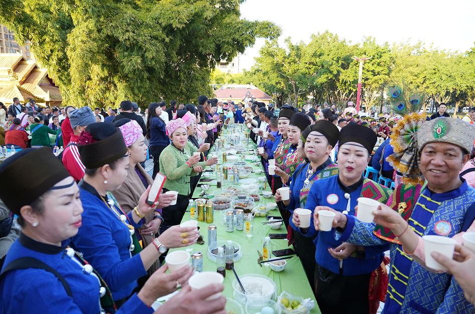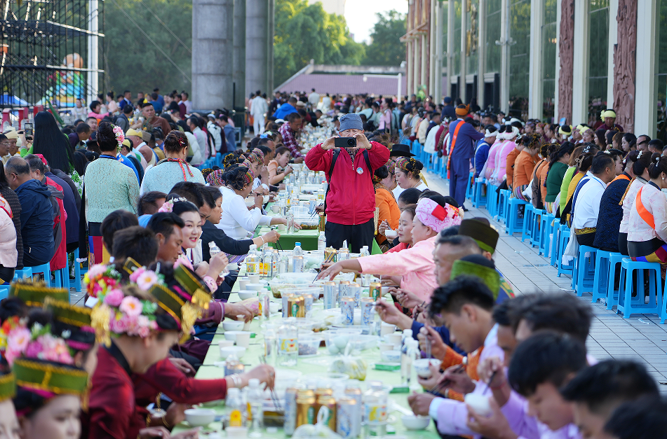 庆典在欢乐的民族团结长街宴中拉开序幕,人们围坐共享特色美食,在热气蒸腾间传递着温情与祝福。
