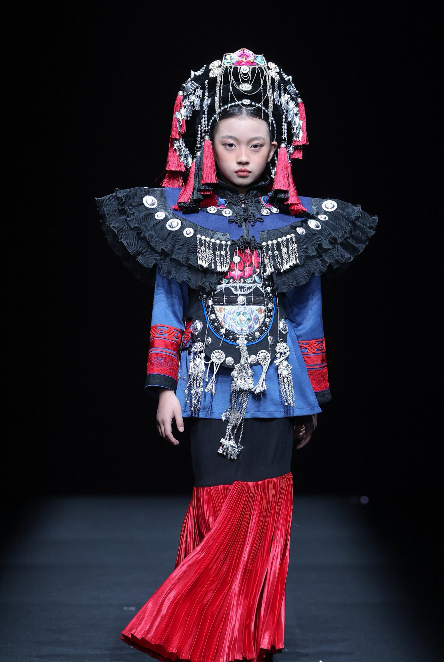 在“花彝裳”专场品牌秀中,精彩亮相的69件彝绣服饰设计作品分为儿童装与成人装两大系列,精准覆盖不同群体审美需求。其中46套儿童装通过彝绣传统纹样与现代潮流的融合,将经典彝绣元素与儿童服饰的灵动特质相结合,兼具观赏性与实用性。其余23套成人装主打“民族韵、国之美”,在保留楚雄彝绣核心技艺与文化内涵的基础上,通过对传统彝绣服饰进行现代化改良,打破了非遗服饰“小众化”“场景化”的局限,让彝绣元素能够自然融入日常穿搭。聚光灯下,模特们身着缀满彝绣纹样的服饰款款前行,既有彝族先民的浪漫情怀,又不失现代设计的简约灵动,每一套服饰都承载着彝族人对生活的热爱与对文化的坚守,赢得现场阵阵掌声。