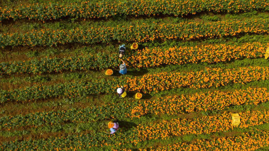 八月,万寿菊以最浓郁的金黄,染透了云南的山地坡岭,也开启了农户们的丰收季。