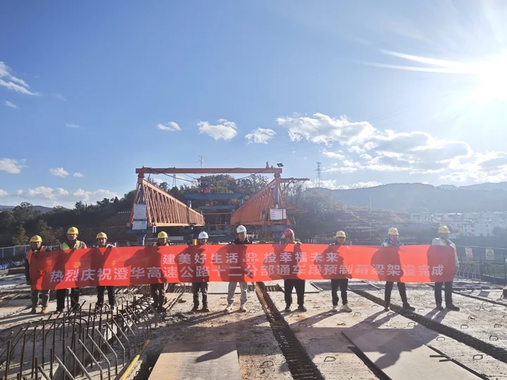 1月4日,澄华高速公路华宁南互通A匝道桥梁板架设完成。华宁南互通A匝道桥全长246.08米,桥面宽2×10.8米,左右幅均采用“4×30米预应力混凝土连续小箱梁+4×30米预应力混凝土现浇箱梁”结构,专为跨越沿线村道与河流建设。