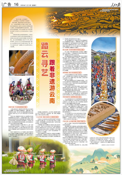 坡芽情歌·富宁非遗探索之旅带您领略壮族歌书文化的魅力;傣韵基诺情·西双版纳非遗体验之旅带您体验傣族与基诺族的文化风情;“非”游不可·大理苍洱毓秀非遗之美体验游带您深度感受白族文化的精髓;遇见丽江·古城寻遗之旅带您体验东巴纸制作、纳西古乐等纳西族传统文化;探寻“阿诗玛”·石林非遗体验之旅让彝族撒尼文化变得可听、可看、可体验。