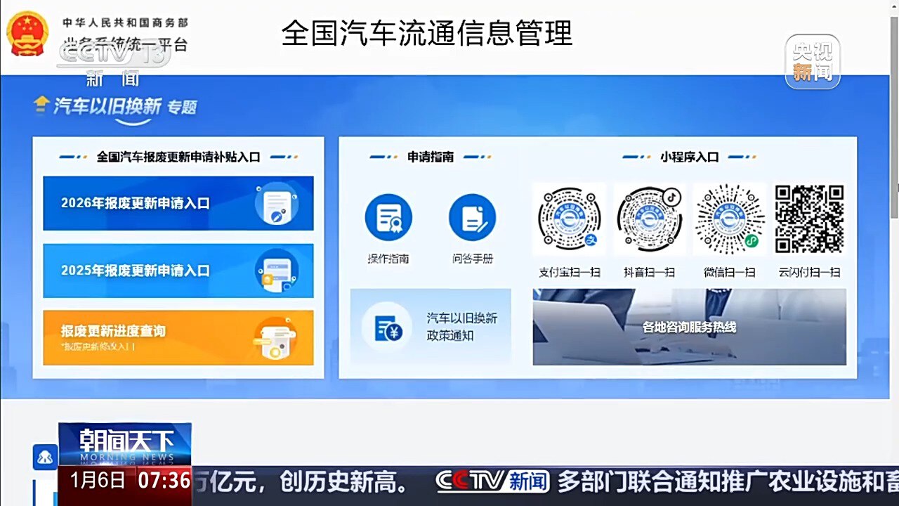 商务部等部门日前印发《2026年汽车以旧换新补贴实施细则》。云南省商务厅也发布公告,自2026年1月1日起,启动2026年云南省汽车以旧换新补贴活动。