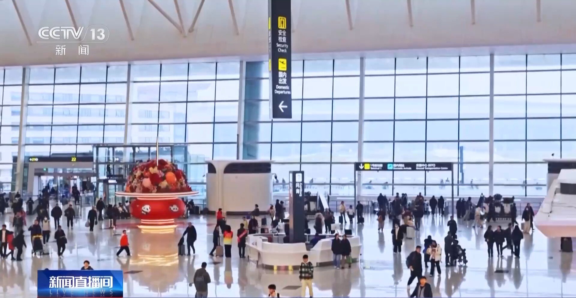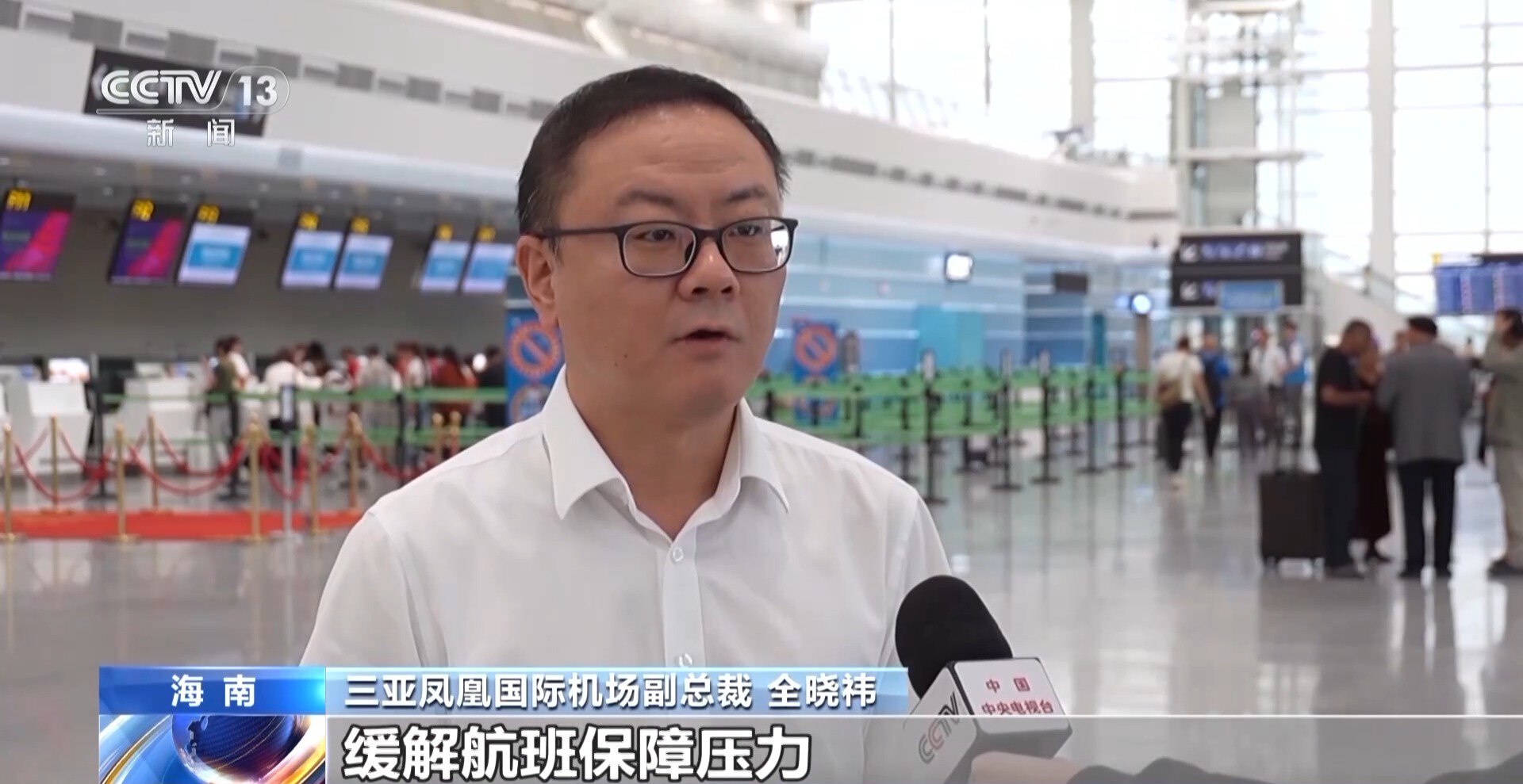 三亚凤凰国际机场副总裁 全晓祎:新航站楼有效分流旅客,缓解航班保障压力。新增的40个值机柜台与23条安检通道,大幅缓解旅客排队压力。