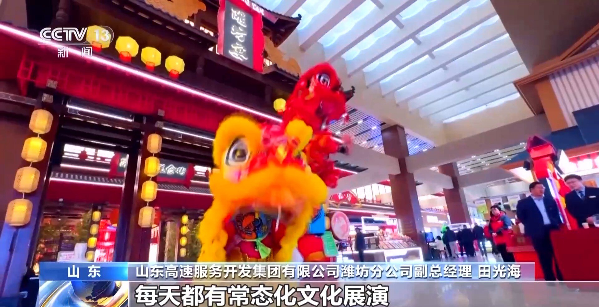 山东高速服务开发集团有限公司潍坊分公司副总经理 田光海:每天都有常态化文化展演,特别是春节期间,文化体验项目参与人次占总客流量的三成以上。打造了“快进慢出”的新型服务区经济,实现了社会效益和经济效益双重丰收。