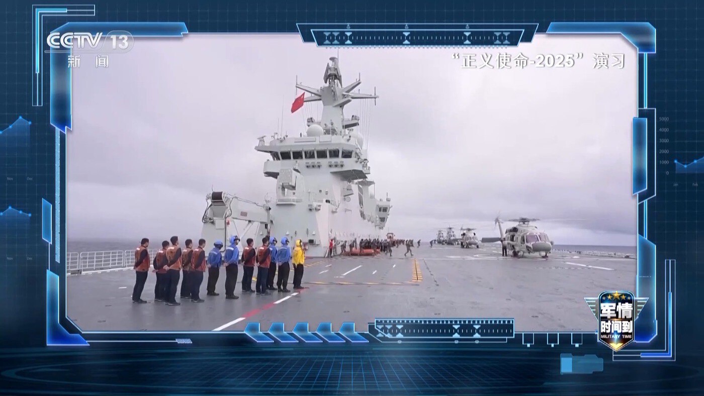 2025年12月29日开始,中国人民解放军东部战区组织陆、海、空和火箭军等兵力,位于台湾海峡、台岛北部、西南、东南和台岛以东,组织“正义使命-2025”演习,重点演练海空战备警巡、夺取综合制权、要港要域封控、外线立体慑阻等科目,舰机多向抵近台岛,诸军兵种联合突击,旨在检验战区部队联合作战实战能力。