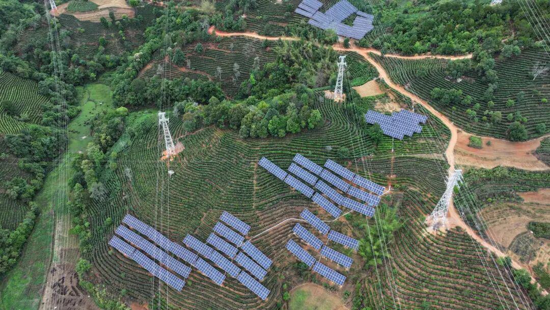 普洱市依托丰富太阳能资源与特色茶产业,创新推行“茶光互补”模式,实现土地立体高效利用。景谷县民乐镇茶光互补项目覆盖4320亩茶园,形成“上发电、下种茶”的立体格局。在一片片生机盎然的茶地里,光伏板与茶树相映成趣,光伏板架设于茶垄上方,既为茶树遮阳避雨,又提升茶叶品质。项目总投资10.3亿元,惠及662户茶农,累计发放土地租金超5680万元,提供就业岗位千余个,实现茶与光的“共生互补”“一地生双金”。