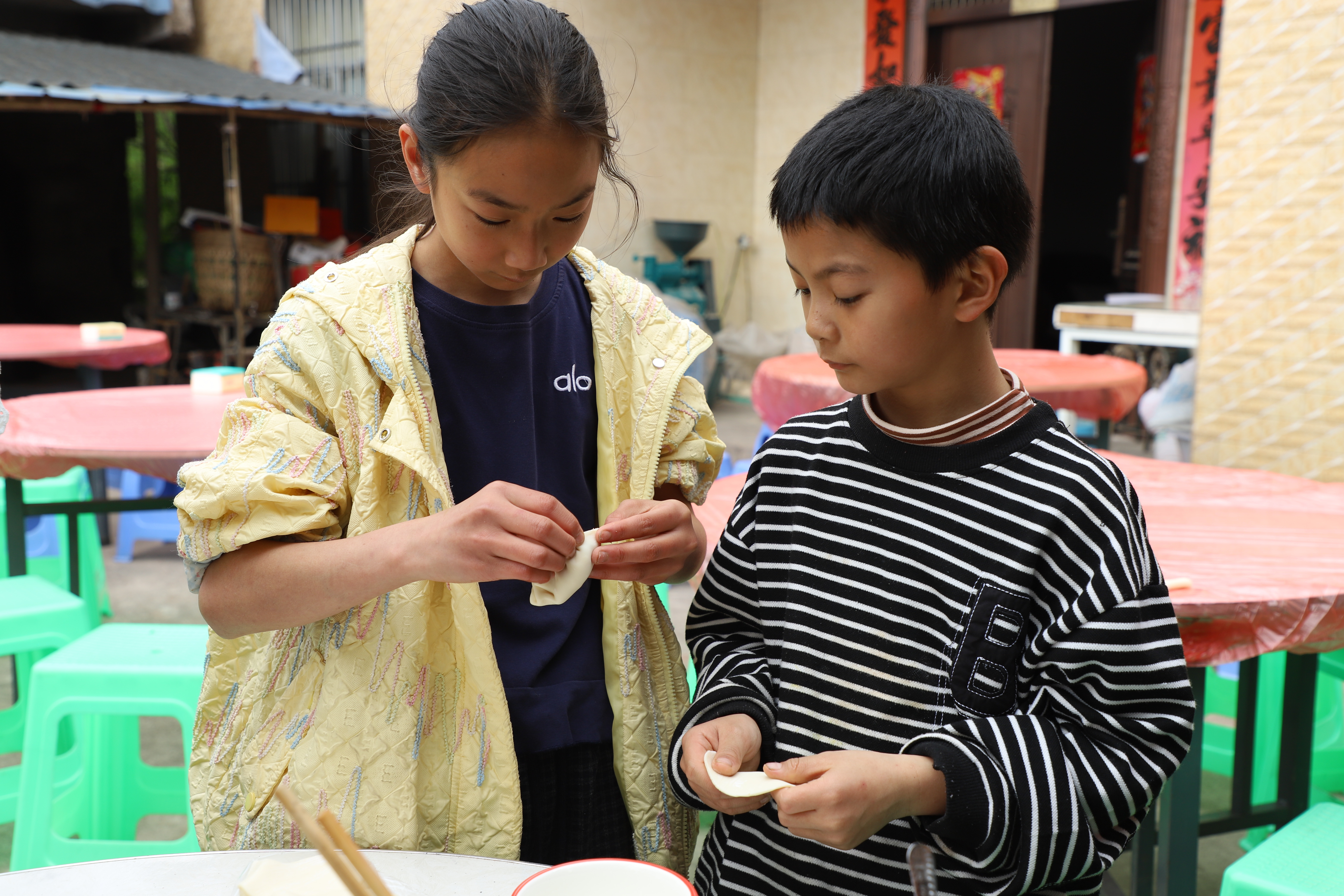 除了采摘,活动现场还设置了包饺子环节,吸引不少小朋友参与。在志愿者的指导下,孩子们围坐在一起,认真包着饺子,虽然形状各异,但个个都成就感满满。家长们在旁边拍照记录,场面温馨热闹。
