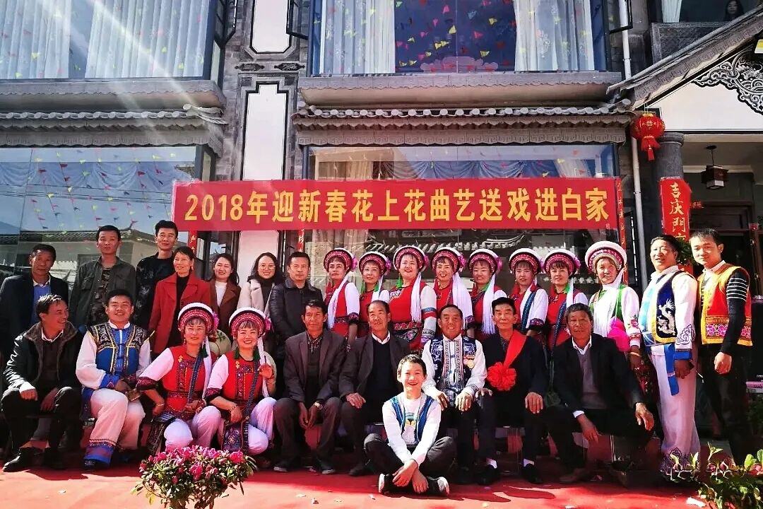 “传承方面,一个是家传,一个是社会传,这两个方式是最重要的,其中家传最重要。社会上有人来学的话,我不收任何价钱,衷心地教他们,现在我有好多学生已经可以独自上台演唱了。”为了让大本曲从“小院戏台”走向更广阔的天地,2016年,赵丕鼎牵头,和儿女们一起成立了“花上花艺术团”。团里的成员既有家里的晚辈,也有周边村镇的大本曲爱好者。每逢农闲或节庆,艺术团就会带着三弦走村串寨,把大本曲送到老百姓的家门口,成了大理乡间传播白族曲艺的“流动戏台”。
