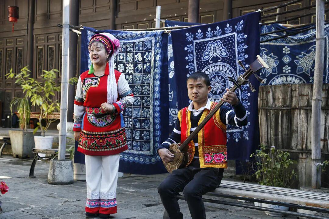 一块醒木定场,三弦琴声悠扬,一口白语唱尽苍洱春秋。在喜洲镇作邑村,一民居小院时常传出三弦的悠扬旋律与醇厚的白族方言唱腔,这是白族绕三灵国家级代表性传承人赵丕鼎的家,也是一个将白族大本曲传唱了五代人的“曲艺世家”。